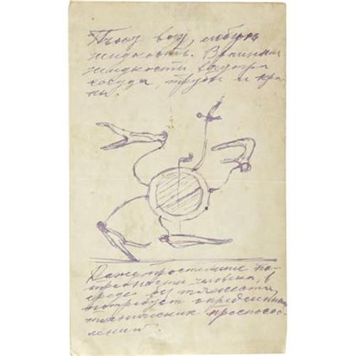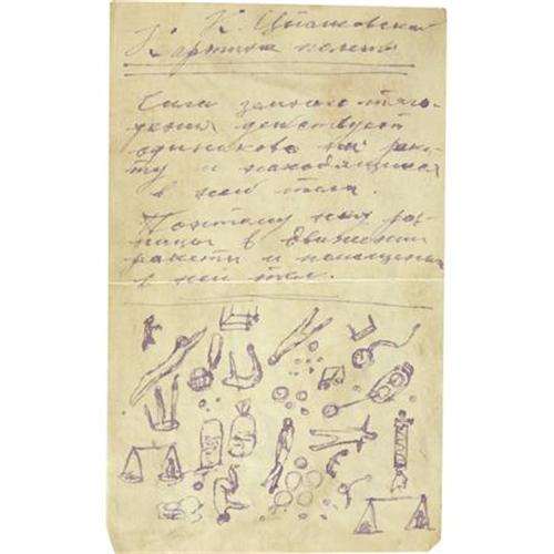 <B>Handwritten Notes and Sketches by Konstantin Tsiolkovsky, Signed.</B></I> One page, two sided, 8.75 x 5.5", n.p., n.d. Tsiolkovsky was a Russian rocket scientist and space travel theorist who published more than 500 works on space travel and related subjects. Among his works are designs for rockets with steering thrusters, multi-stage boosters, space stations, airlocks, and closed biological systems designed to provide oxygen and food for space colonists. Here, Tsiolkovsky makes notes about weightlessness in space. Roughly translated, it reads in part: "<I>The power of earth weight acts the same way on both the rocket and bodies inside it. That is why there is no difference in the movement of the rocket and bodies put inside it. [As] they drink water, and any other liquids, the liquid moves in circles inside the vessel... Even the most common needs of man in a weightless condition, demand some technical devices</B></I>." The page is signed by Tsiolkovsky and includes several interesting sketches, the most impressive of which is his idea of a spacewalk, with humans floating freely while tethered to the main spacecraft structure. Moderate soiling and age toning; very good condition.<BR><BR><b>Shipping:</b> Miscellaneous Collectibles, Smal (<a target="_blank" href="http://www.heritageauctions.com/common/shipping.php">view shipping information</a>)
