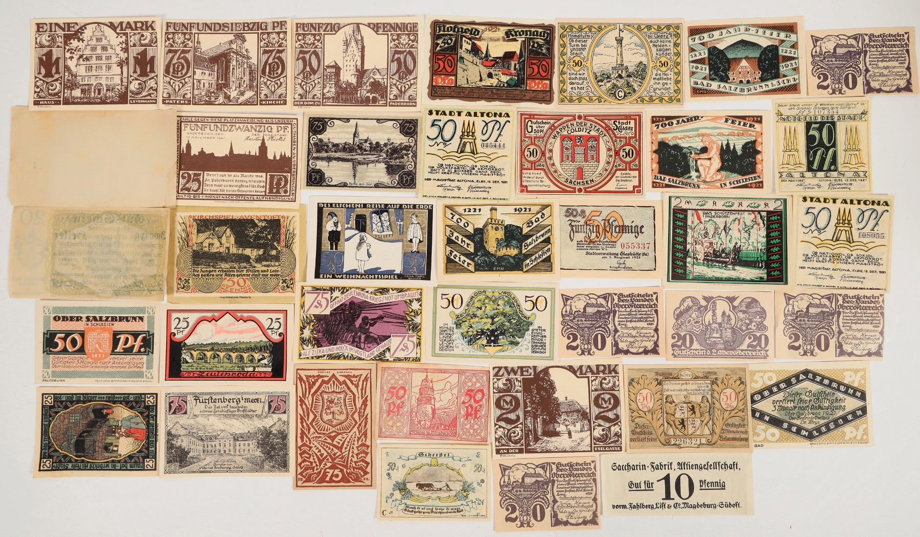 Thirty seven colorful pieces of Notgeld. Notgeld ("emergency money") was a form of paper currency issued by local authorities in Austria and Germany during World War I and the interwar period to combat currency shortages and hyperinflation when national money was insufficient. These distinctive notes are colorful, illustrated with local folklore, historical events, or cultural scenes. They served to stabilize local economies by facilitating trade and allowing communities to maintain their own distinct identities during times of crisis.
