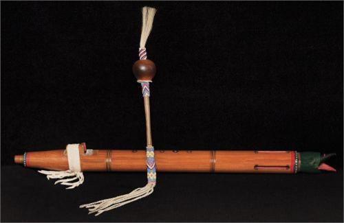 Northern Plains Flute together with Beaded Peyote Gourd Rattle. Flute is 24” long. Rattle is 18” long with fringe and horsehair top. 20th Century. Both fine condition. (est $300-500).