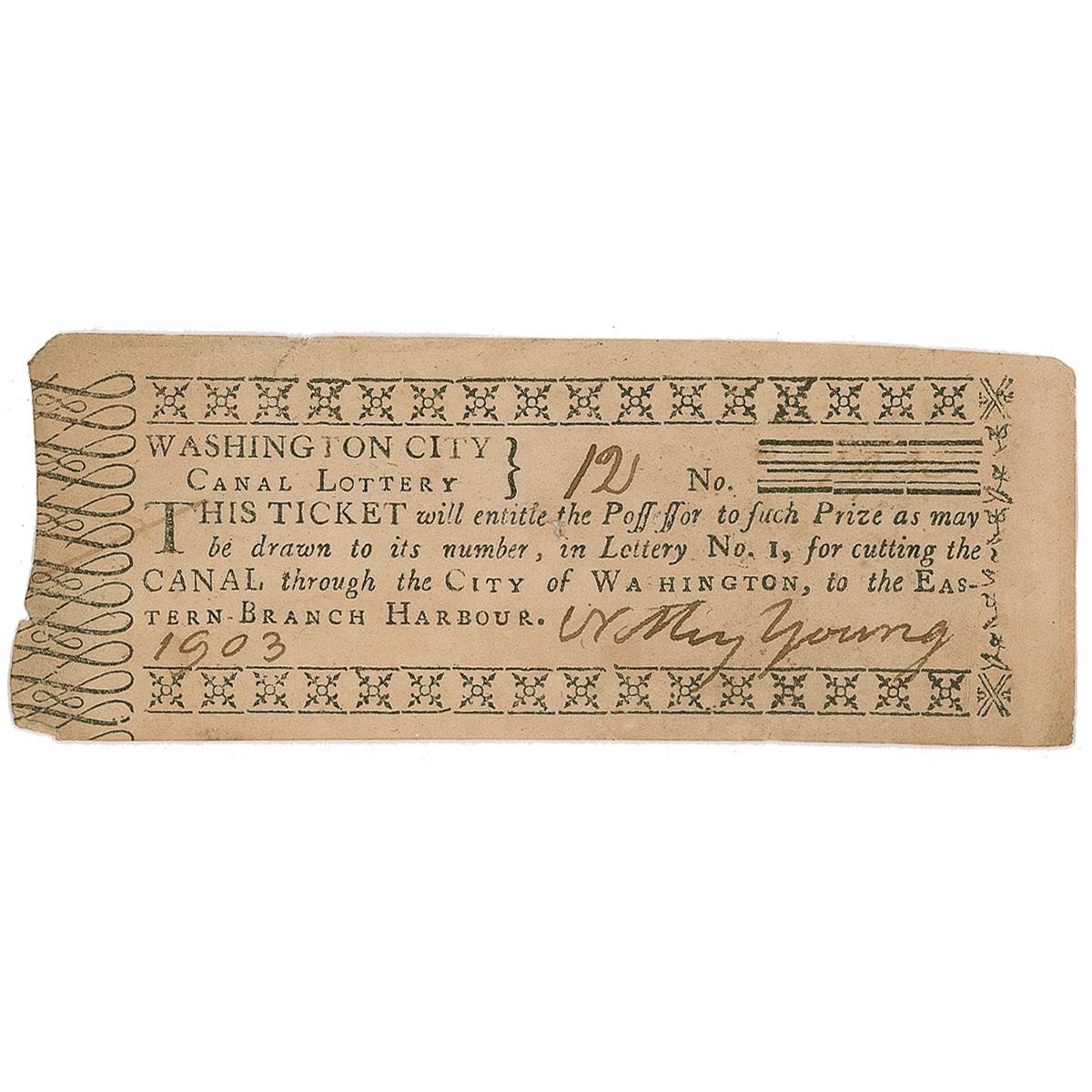 Prominent land owner and businessman who owned much of the land which became Washington, D. C. An early American lottery ticket, 4 x 1.5, circa 1790s, issued to help fund the Washington City Canal "for cutting the Canal through the City of Washington to the Eastern-Branch Harbour." Numbered in the manuscript and signed at the bottom by Young. Two small punch holes to center, and scattered light toning and soiling, otherwise fine condition.