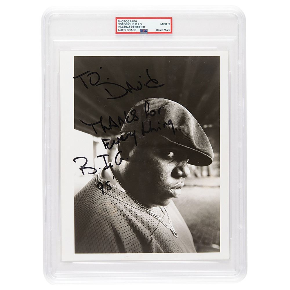 Scarce and highly sought glossy 8 x 10 close-up photo of Biggie Smalls, aka The Notorious B.I.G., signed and inscribed in black felt tip, "To David, Thanks for everything. B.I.G., 95.& rdquo; In fine condition. Authentic signed photos of The Notorious B.I.G. are incredibly rare, with this choice example being just the second we have offered. Encapsulated and graded by PSA/DNA as "MINT 9."