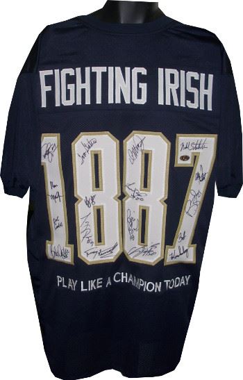 One of the most iconic and successful programs in college sports with their first season starting in 1887, the Fighting Irish hold the highest winning percentage among college football programs and have 13 national championships recognized by the NCAA, tied for first out of all FBS schools in the NCAA era. A record seven Notre Dame players have won the Heisman trophy, and the program has produced 97 consensus All-Americans, 33 unanimous All-Americans, and 50 members of the College Football Hall of Fame, all NCAA records. This Notre Dame Fighting Irish Greats Navy Custom Jersey 1887 with 16 signatures is signed by: Bobby Taylor, Ken MacAfee, Bob Crable, Bob Golic, Terry Hanratty, Tony Rice, Vagas Ferguson, Tom Gatewood, Bob Kuechenberg, Reggie Brooks, Allen Pinkett, Mike Stonebreaker, Derrick Mayes, Todd Lyght, Luther Bradley & Chris Zorich. This is an unlicensed custom-prostyle Navy jersey with twill stitched nameplate and numbers . MAB Hologram and Certificate of Authenticity from Athlon Sports.