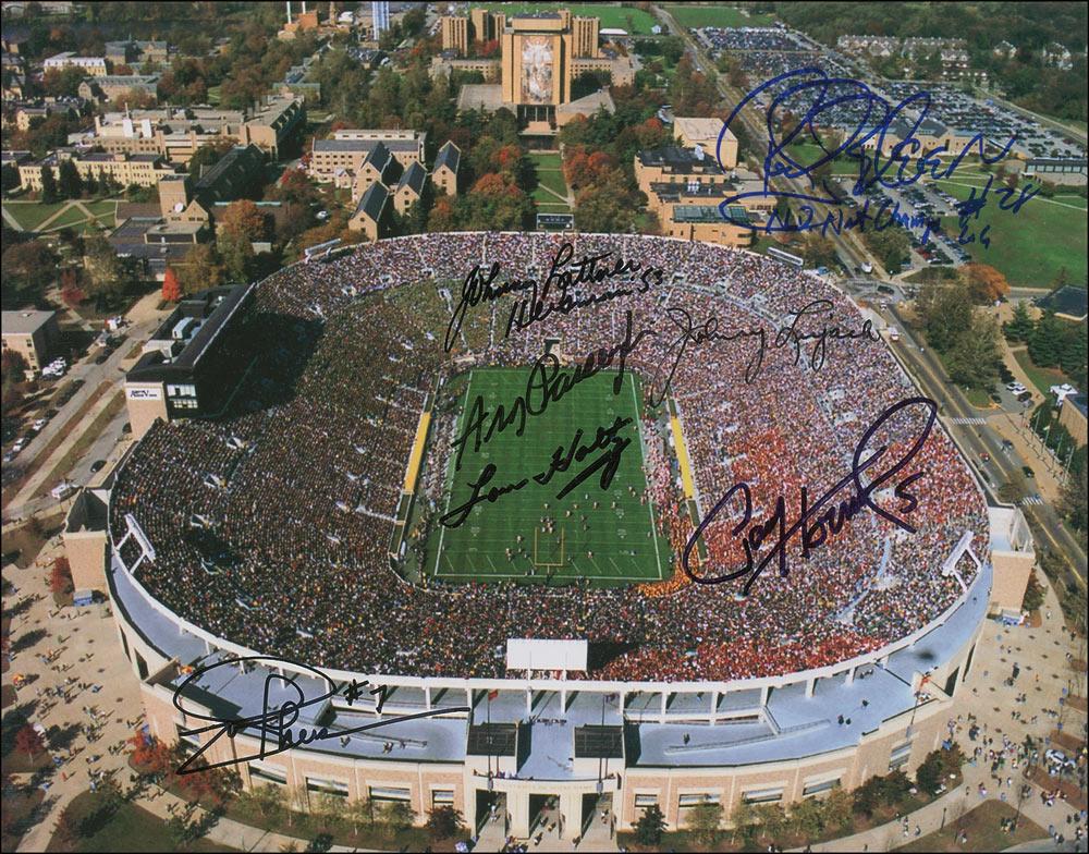 Color glossy 14 x 11 photo of a jam-packed Notre Dame Stadium, signed in blue and black felt tip by Ara Parseghian, Lou Holtz, Paul Hornung, Johnny Lujack, Johnny Lattner, Joe Theismann, and Rocky Bleier. In very fine condition.