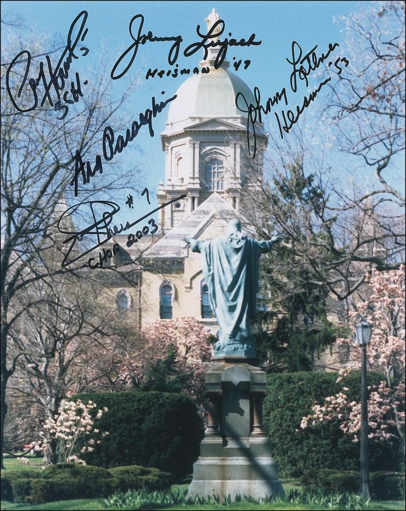 Color glossy 8 x 10 photo of Notre Dame’s Golden Dome, signed in black felt tip by Johnny Lattner, Johnny Lujack, Ara Parseghian, Paul Hornung, and Joe Theismann. In very fine condition.