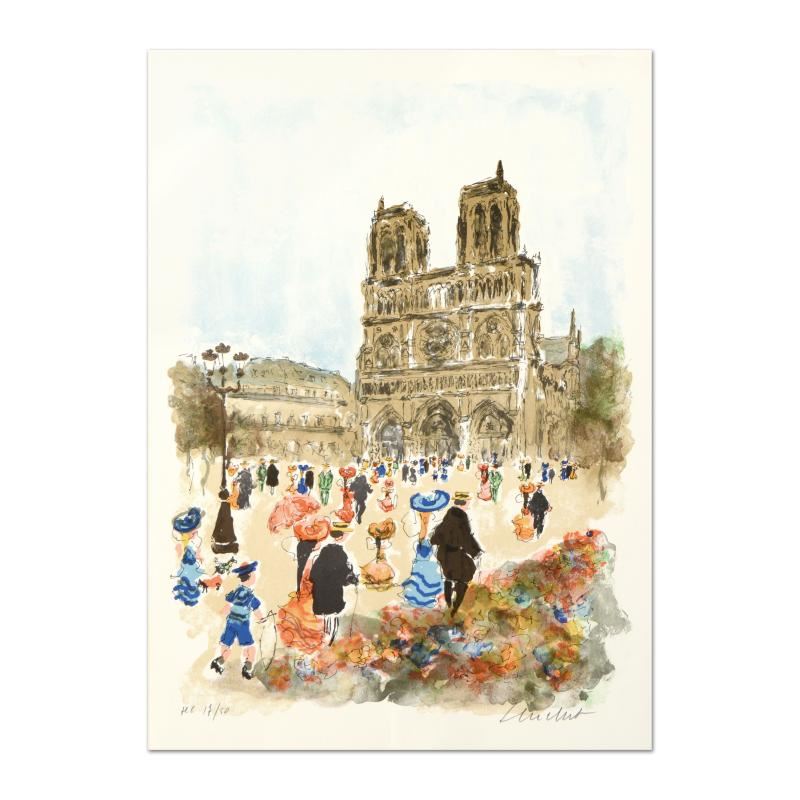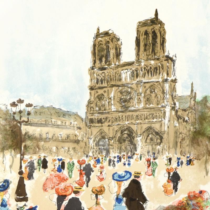 "Notre Dame" is a limited edition lithograph on paper, numbered and hand signed by the artist! Measures approx. 21" x 29.5" (border). 19" x 27" (image).