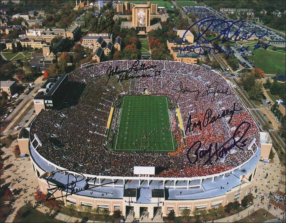Color glossy 14 x 11 photo of a jam-packed Notre Dame Stadium, signed in blue and black felt tip by by Ara Parseghian, Joe Theismann, Paul Hornung, Lou Holtz, Rocky Bleier, Johnny Lattner, and Johnny Lujack. In very fine condition. Pre-certified Steve Grad/PSA/DNA and RRAuction COA.