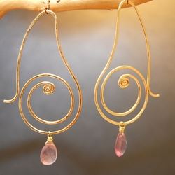 Metal: Gold Hammered swirly drop-hoops with your choice of stone (amethyst and peridot shown), about 2". Additional stone sets may be purchased for a variety of looks. Available in either 14K gold-filled, rose gold-filled, or sterling silver. All jewelry is entirely handmade in our studio in New York.