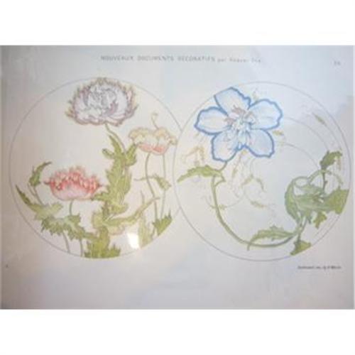 From the "Nouveau Documents Décoratifs en couleurs" by Habert-Dys, these prints were used at the turn of the last century by designers and decorators as inspiration for wallpaper, interior design, ceramics, and all manner of home decor. Please note that as these prints are over 100 years old they exhibit some signs of use - pencil marks, etc. No tearing, no staining, no foxing. Print was photographed in its plastic sleeve - reflection is from sunlight and no shadows appear on the print. Exquisitely colored and detailed they will be beautiful framed (alone or in a grouping)... These prints were purchased in Europe. PLEASE NOTE THAT ALL OF OUR PRINTS, POCHOIRS AND POSTERS ARE ORIGINAL, NON REPRODUCTION WORKS. Please check out our other items for sale on this site to see the selection of items we have - we add new pieces almost daily. Page measures 8.5 x 12.