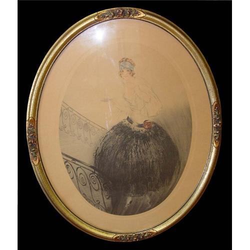 A nice early 20th century lithograph "Bon Soir" by Jean Gilles, very much in the Art Nouveau Icart manor depicting a 20's gal with an extra poofy dress ascending a flight of stairs with chamber stick in hand, housed in a period oval floral adorned gilt wood frame and would make a charming or addition to any fine household or collection.