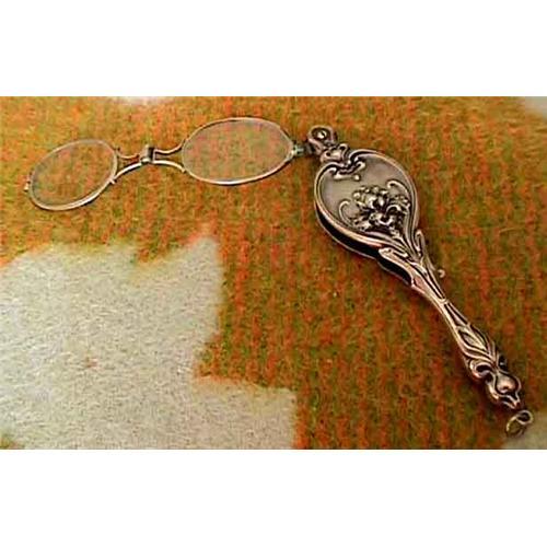 Lorgmettes are hand held spectacles (eyeglasses) that were fashionable during the Victorian and Edwardian periods (third quarter of the 1800's to 1920).