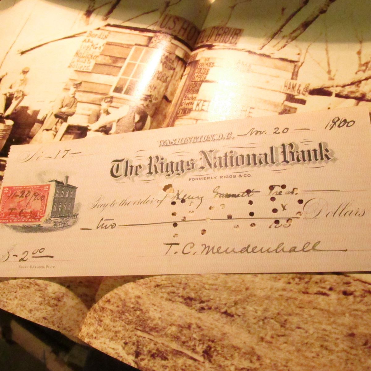 Nov. 20, 1900 "The Riggs National Bank", Washington, D.C. with initialed Two Cent Documentary Stamp. Signed by Thomas Corwin Mendenhall (1841-1924). American Physicist; known for his researches in gravity, electricity, and atmospheric electricity, With vignette of bank. A rare bank check as Mendenhall wrote only 21 checks on this bank (1896-1901). When 'Doc' purchased this piece it had an estimated value of $200-250.00.
