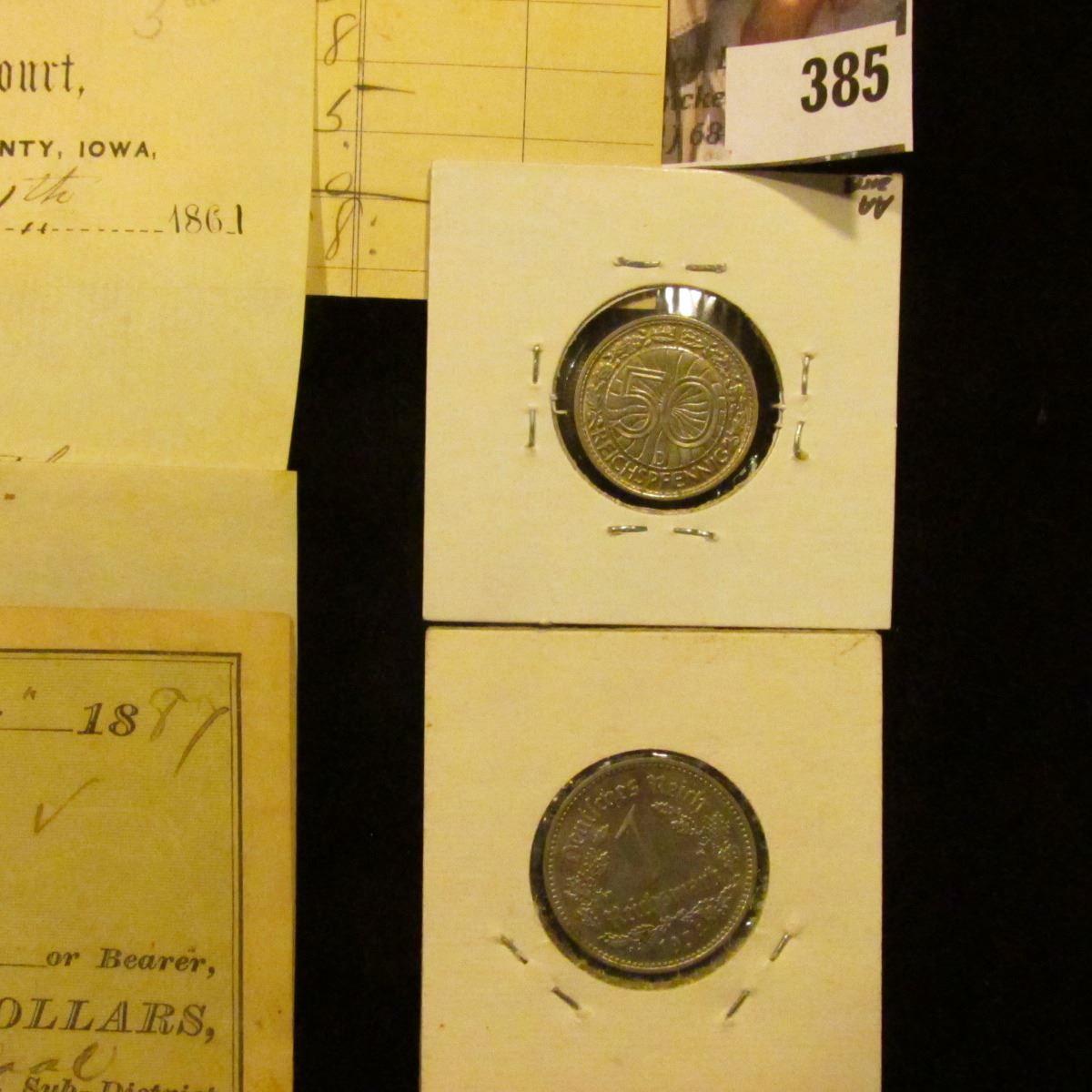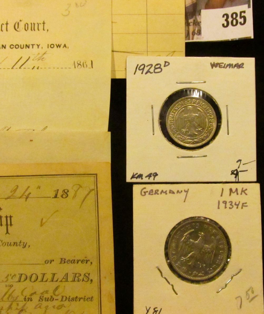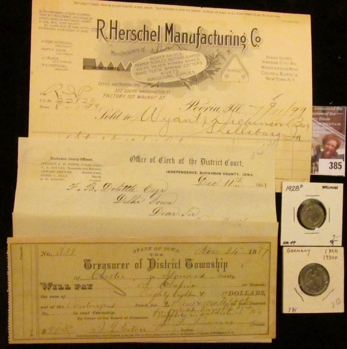 Nov. 24, 1897 "State of Iowa The Treasurer of District Township of Chester in Howard County" Check; Dec. 11th, 1861 Letter on letterhead "Office of Clerk of the District Court Independence, Buchanan County, Iowa"; 1899 Invoice "R. Herschel Manufacturing Co."; 1928D Weimar Republic, Germany 50 pfennig BU; & 1934F Germany 1 Reichsmark, BU.