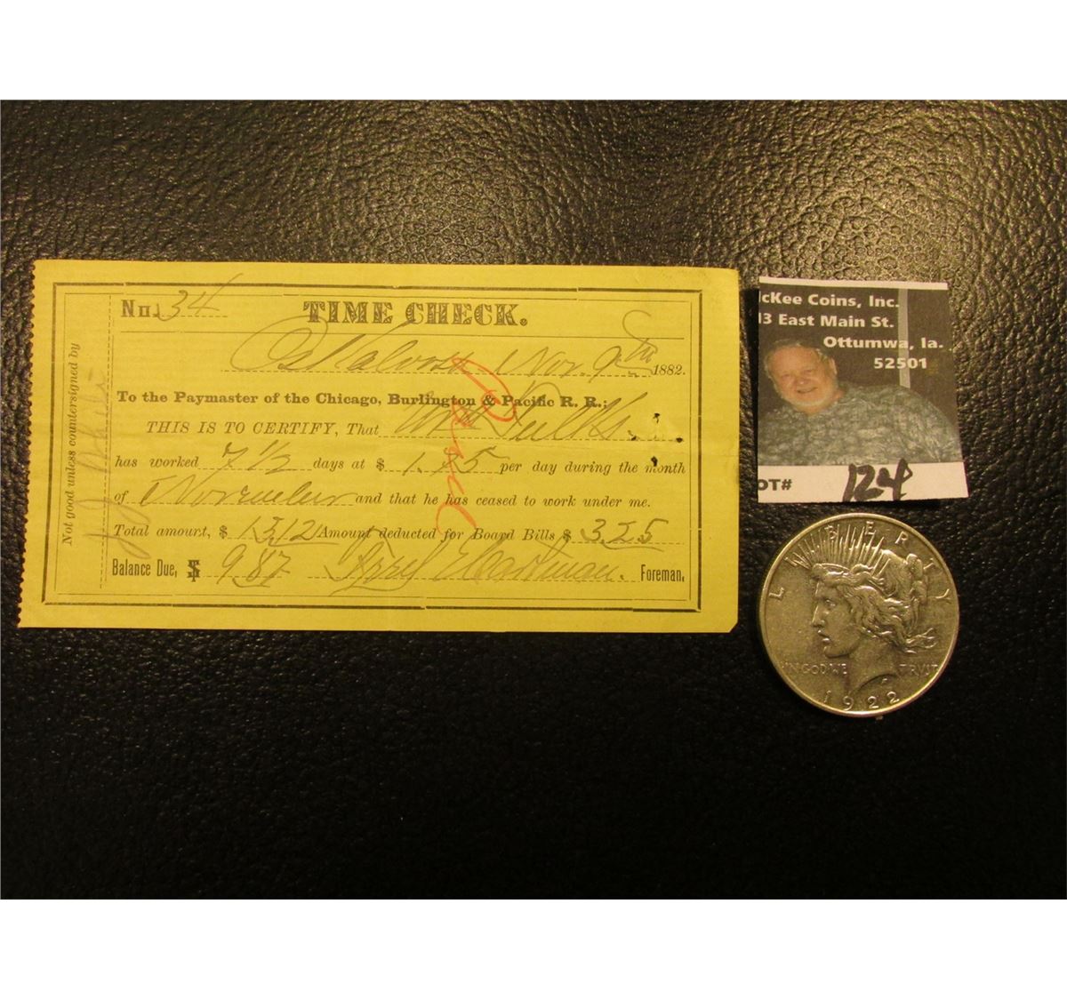 Nov. 9th, 1882 Oskaloosa, Iowa Time Check for a Foreman on the "Chicago, Burlington, & Pacific R.R."; & 1922 D U.S. Peace Silver Dollar, VF.