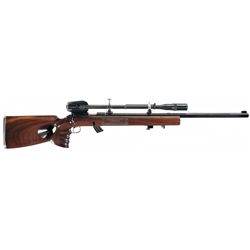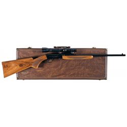 A) Manufactured 1956-60. Scroll engraved receiver with checkered forearm and grip. Wheel adjustable rear sight. T77198 on bu