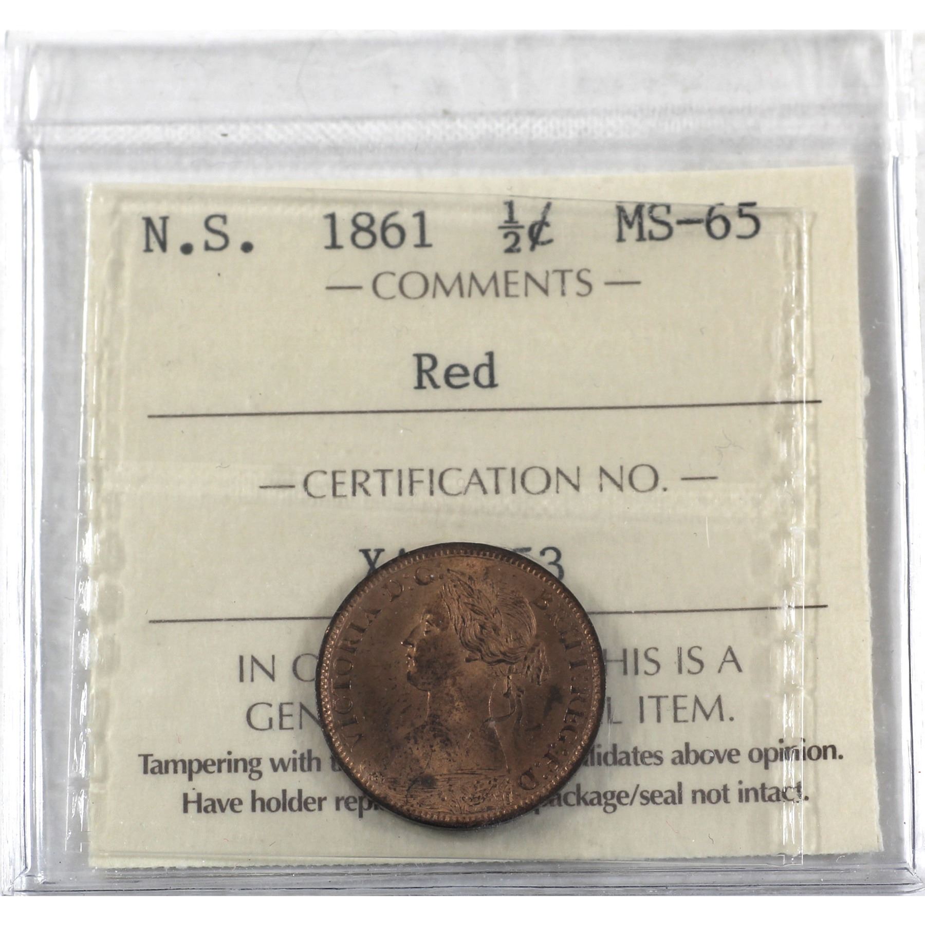 Nova Scotia 1/2-Cent 1861 ICCS Certified MS-65 Red.