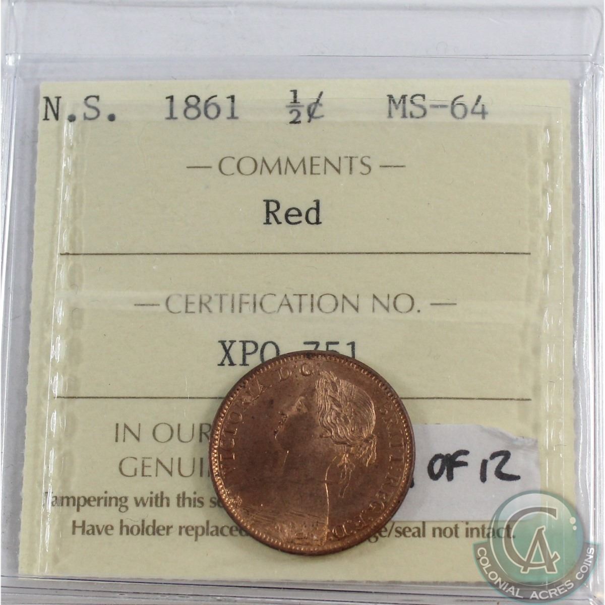 Nova Scotia 1/2-cent 1861 ICCS Certified MS-64 Red. Tied for the highest grade by ICCS. A Well struck coin with lustrous red fields.