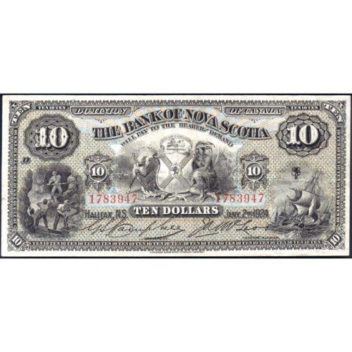 The Bank of Nova Scotia Ten Dollars 1924, CH 550-32- Serial Number 1783947 D, VF. A well-centered note with folds and crumples, but no hard creases