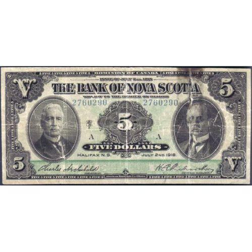 The Bank of Nova Scotia Five Dollars 1918, CH 550-30-02 Serial Number 2760290 A, PMG Net Very Good 8, Tape, Repaired Tear