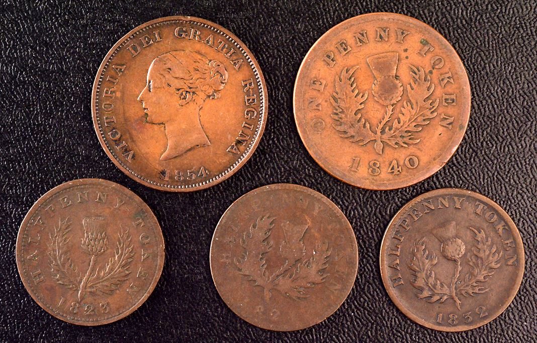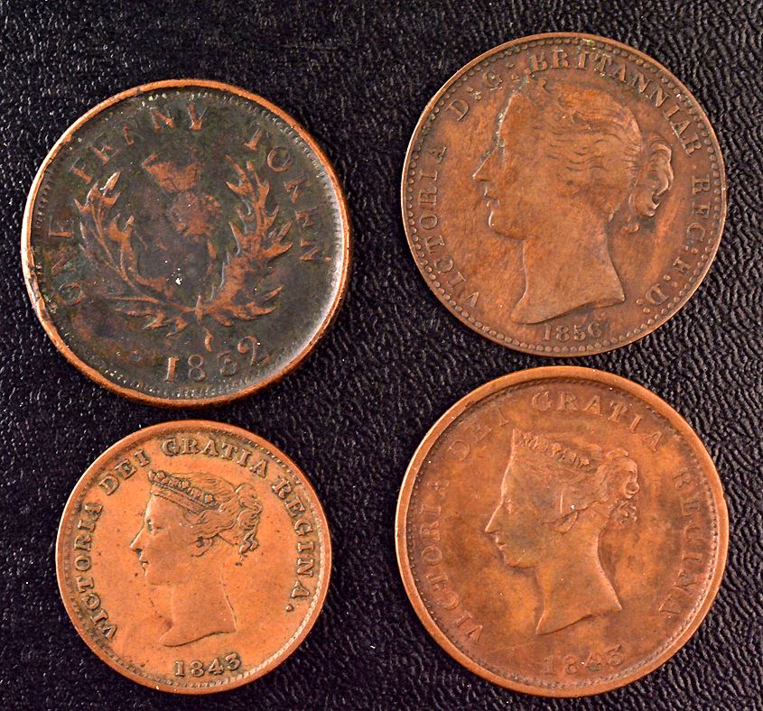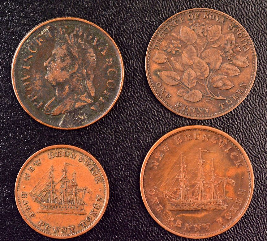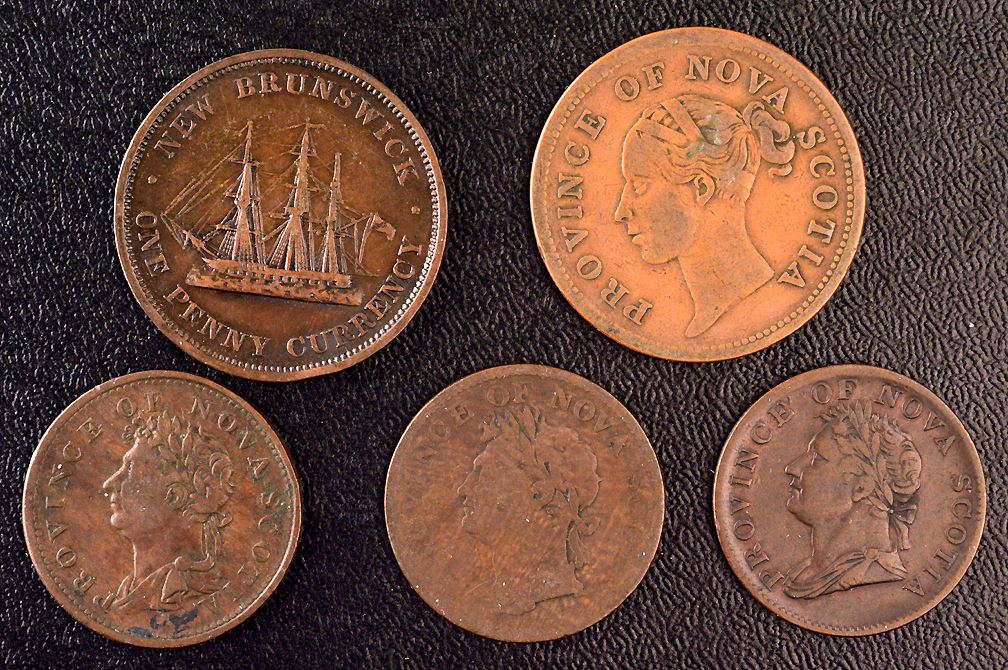 Nova Scotia, Half Penny, 1823, Br.867, NS-1A4; 1824, Br.869, NS-1C1, G-VG; 1832, Br.871, NS-1D3; Penny, 1840, Br.873, NS-2C1; 1856, Br.875, NS-6A1; CTFT. Penny, 1832, Br.870, NS-4A4, corrosion; New Brunswick, Half Penny, 1843, Br. 910, NB1A1; Penny, 1843, Br.909, NB2A; 1854, Br.911, NB-2B1; Fine to VF, unless noted; total of 9 pcs.