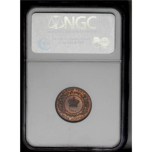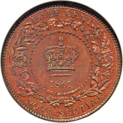 <B>Nova Scotia Victoria Specimen Half Cent 1861, </B></I>KM7, Specimen 64 Red & Brown NGC, a splendid example with abundant deep red mint luster. The Belzberg coin was MS64 Brown and most known specimens are not lustrous. Rare and most desirable in this quality.