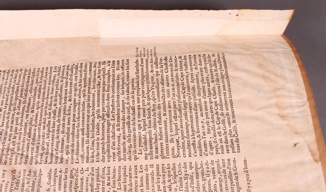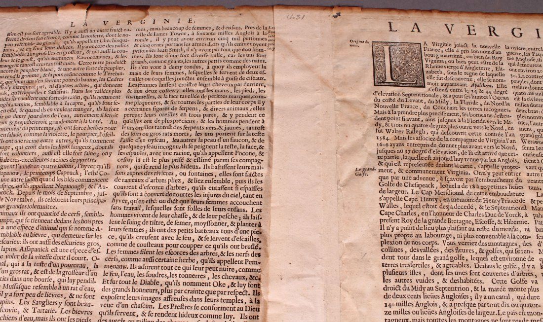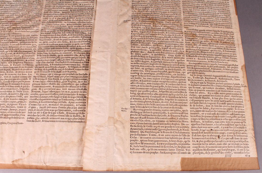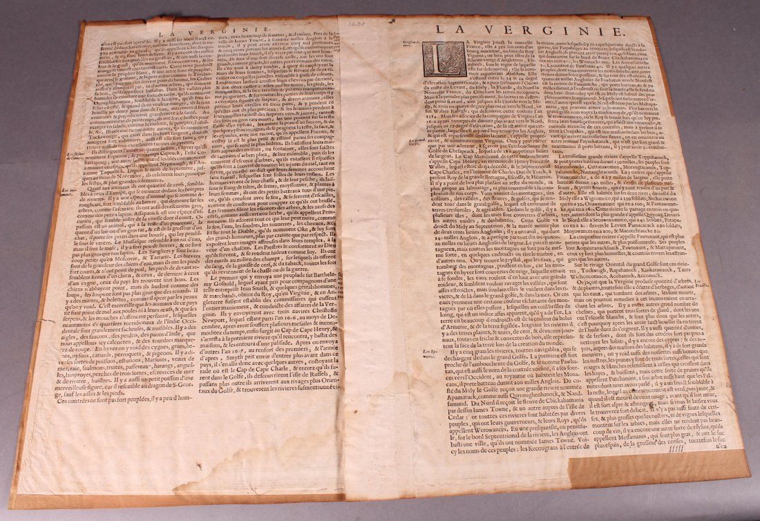 [Virginia]. Nova Virginiae Tabula. Below scale in Roman type: ?Amstelodami, ex officinal Henrici Hondii.? ?This is Henricus Hondius? derivative of John Smith?s highly important map of Virginia, 1612. It is, however, drawn from his deceased brother Jodocus? version of 1618? upon the death of Jodocus, Willem Blaeu acquired a number of plates from the estate? The Virginia was one of the first engraved?? -Burden 228. [1639-1642]. French text on verso and signature ?fffff? on right side of verso's lower margin. Derivative 5, State 1. Tooley, ?The Mapping of America,? p165. Cartouche features Powhatans around a fire, below which is the phrase ?Status Regis Powhatan? in Roman type. The Native American on the right side of the map faces to the left, has a bow in his left hand, and a club in his right hand. Crowned coat of arms at upper right. Modern hand-colored outline with coloring of engraved decorations. 15? x 19 ??.