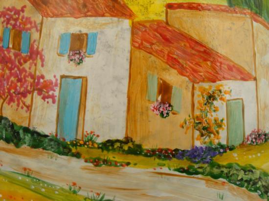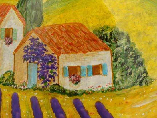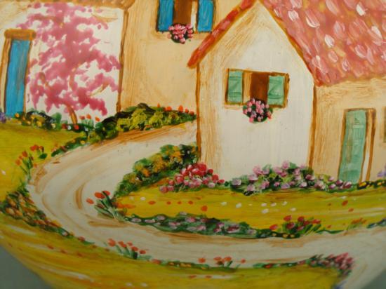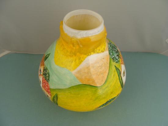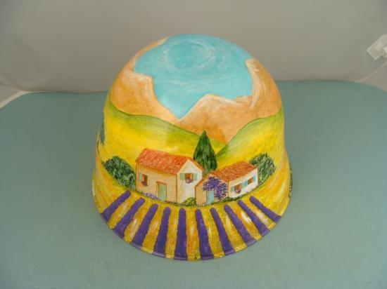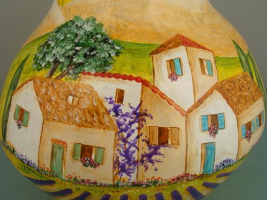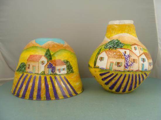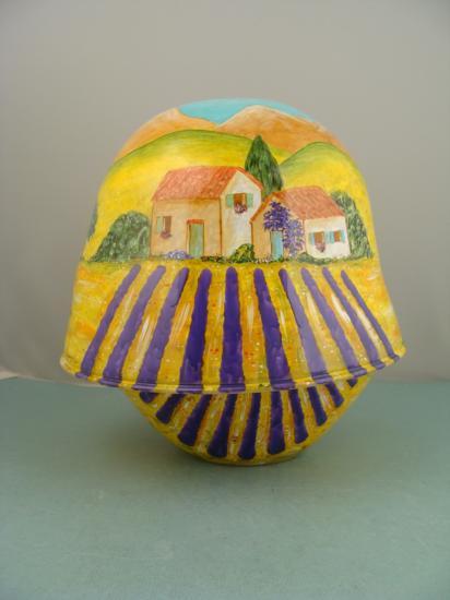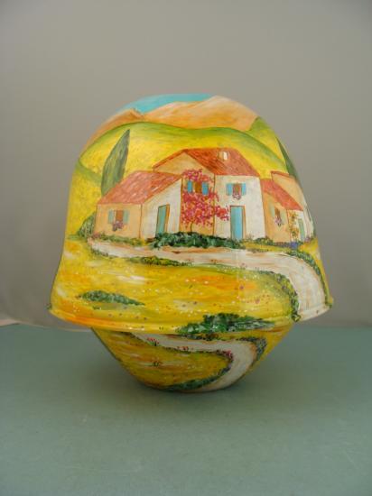 This two piece art glass sculpture was hand crafted by the French master glass artist Novaro. It it also hand painted with lovely images of rolling countryside in the south of France, with small houses. It is both a work of sculpture and a painting. The rounded form of the glass makes a nice surface for the hillside terrain imagery. The scene is yellow in tone, and has the mood of a bright, warm, sunny day. The two pieces can be displayed as separately, or together.