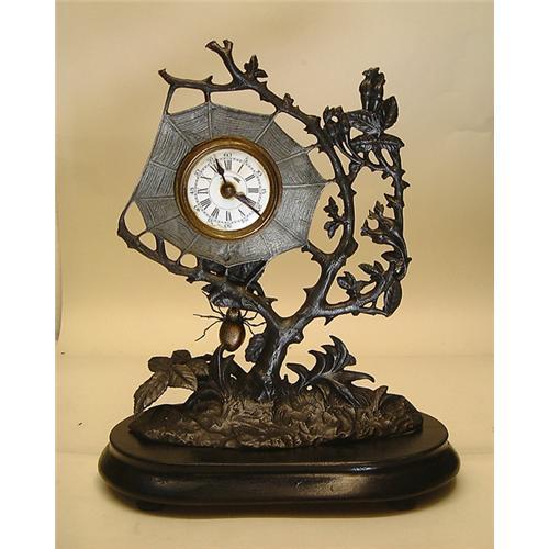 Antique clock,19th c french.Completely original.This unique gothic design is based on a beautifully silvered spiders web. A charming black spider swings in and out of the web as the pendulum.