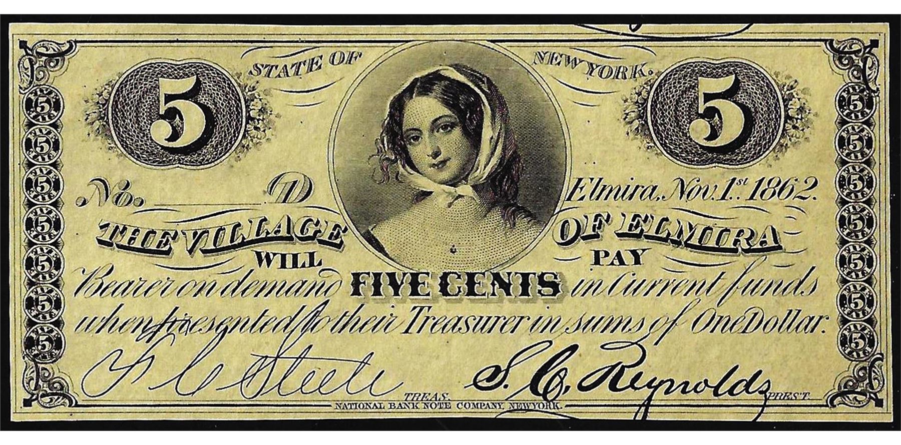 November 1, 1862 Five Cents Village of Elmira State of New York Obsolete Note