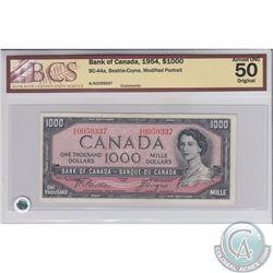 1954 Bank of Canada Modified $1000. BC-44a, Beattie-Coyne, S/N: A/K0059337, BCS AU-50, Original. A respectable example of a scarce signature combinat