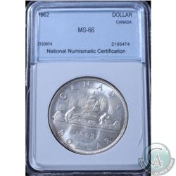 Silver $1 1962 National Numismatic Certification MS-66. We recommend that you view the lot to form your own opinion of the grade. Sold as is, no ret