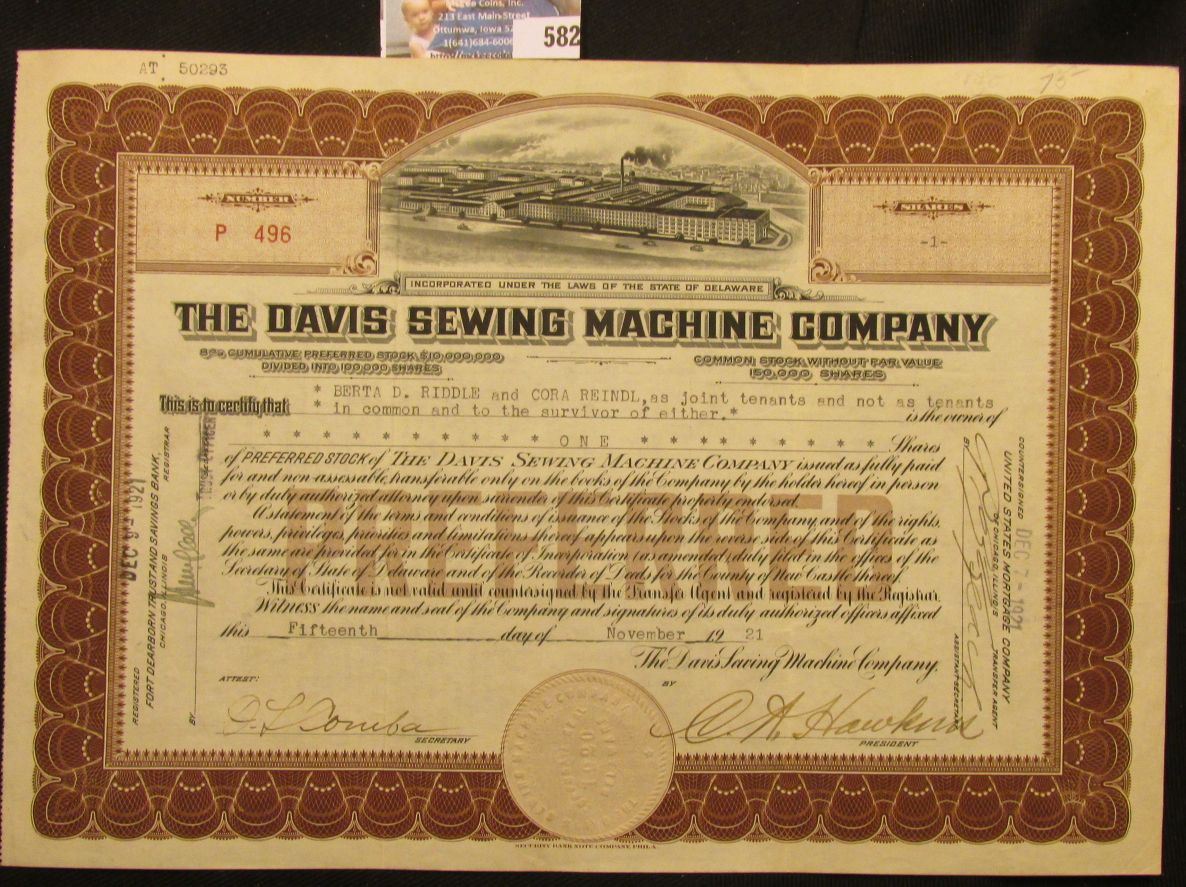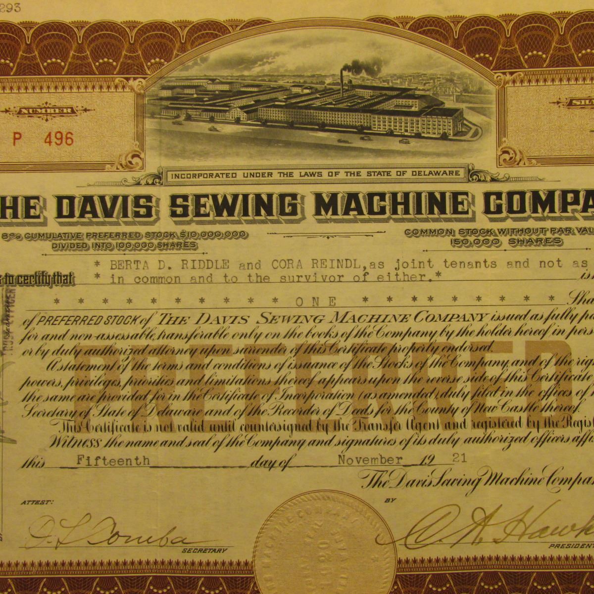 November 15th, 1921 Certificate for One Share "The Davis Sewing Machine Company" Incorporated under the Laws of the State of Delaware, signed by the Secretary and President.