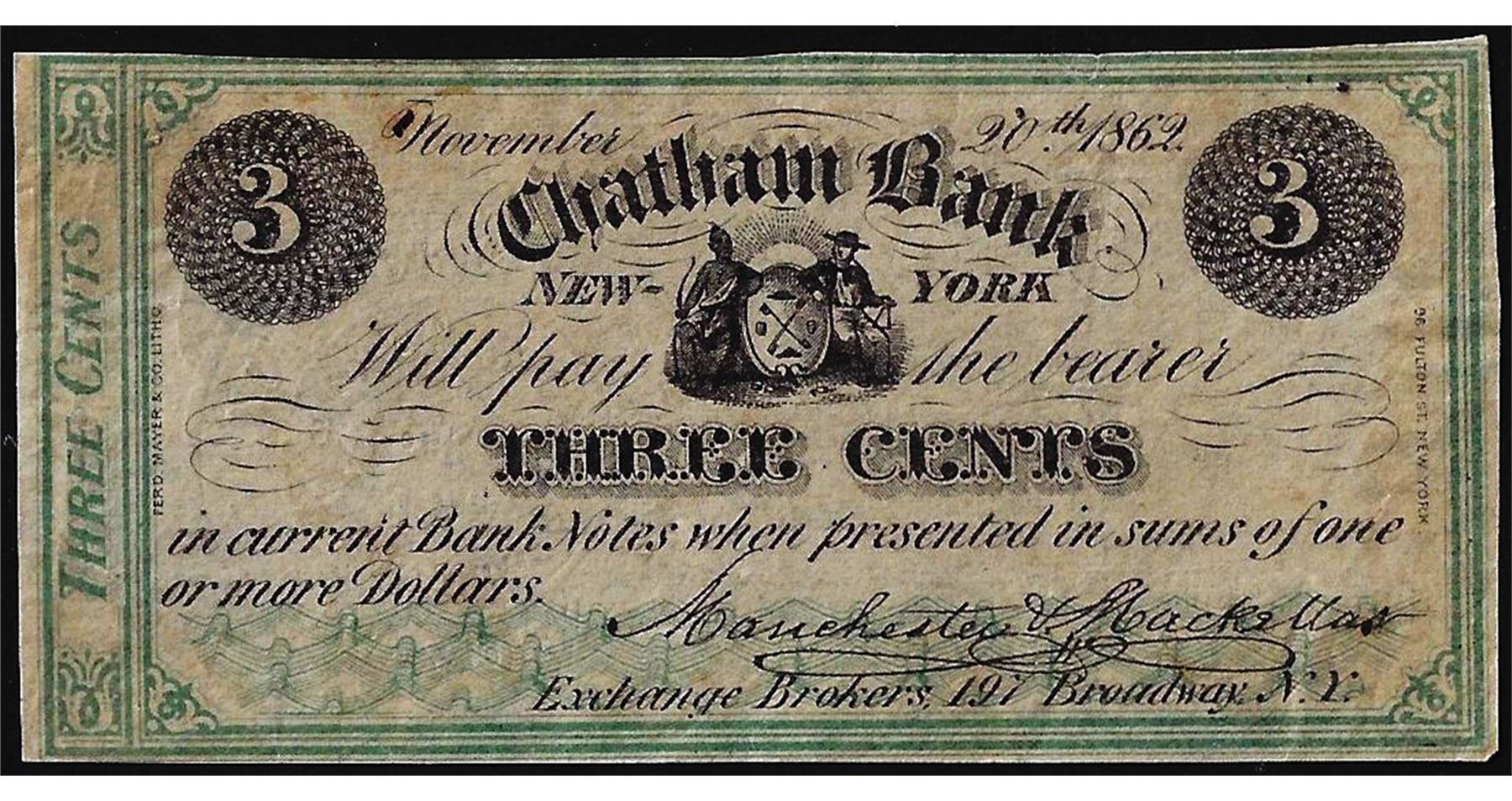 One November 20, 1862 Three Cents Chatham Bank, New York Obsolete Note.
