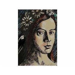 [Canadian RCA b. 1927] UNTITLED PORTRAIT (WOMAN WITH FLOWERS IN HER HAIR) Mixed media on paper 6 x 4.25 in. Signed.<