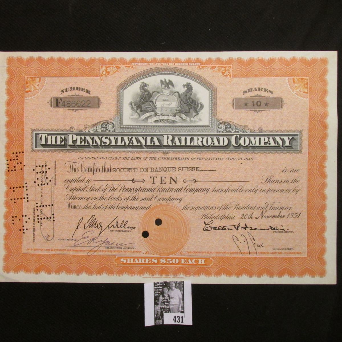 November 20th, 1951 10 Shares of "The Pennsylvania Railroad Company" center vignette rearing stallions to central design with eagle atop.