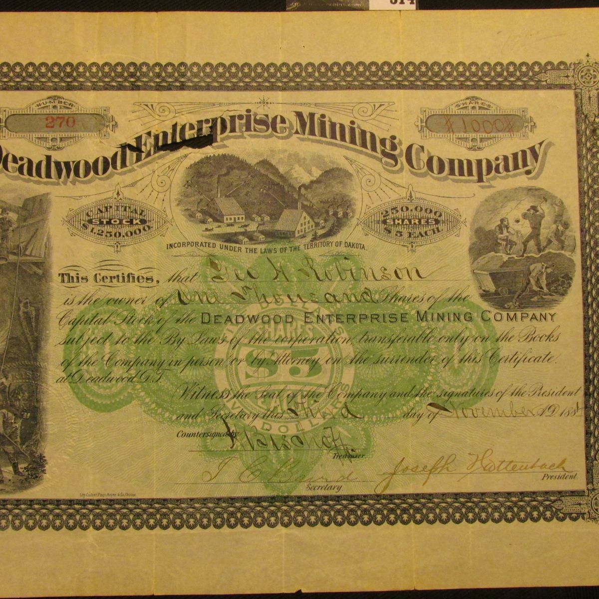 November 3rd, 1884 1,000 Shares of Capital Stock in "Deadwood Enterprise Mining Company…Territory of Dakota", 1 1/2" tear above central vignette and small tear in right border, vignettes illustrate mining scenes. 'Doc' valued this Certificate at $295.00.
