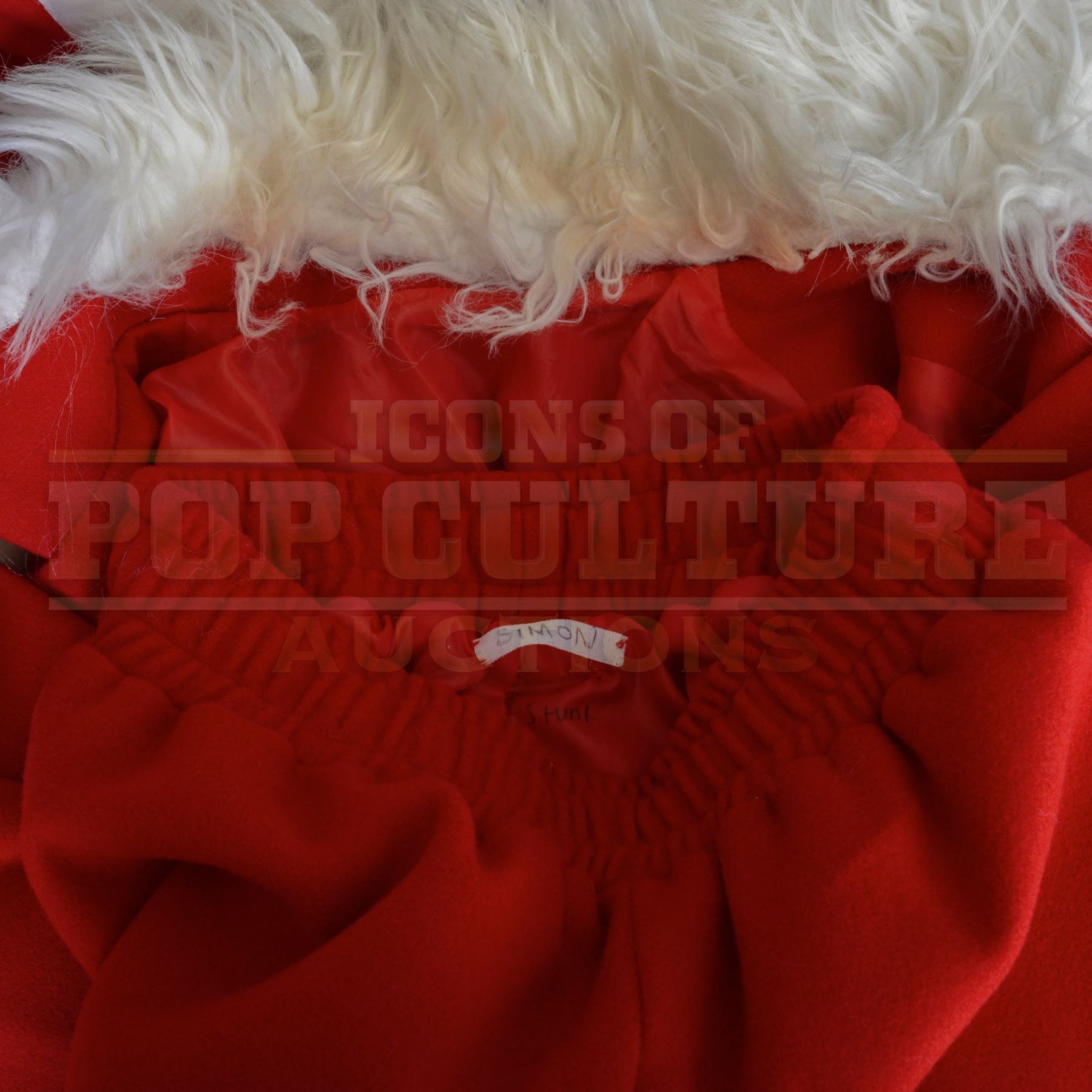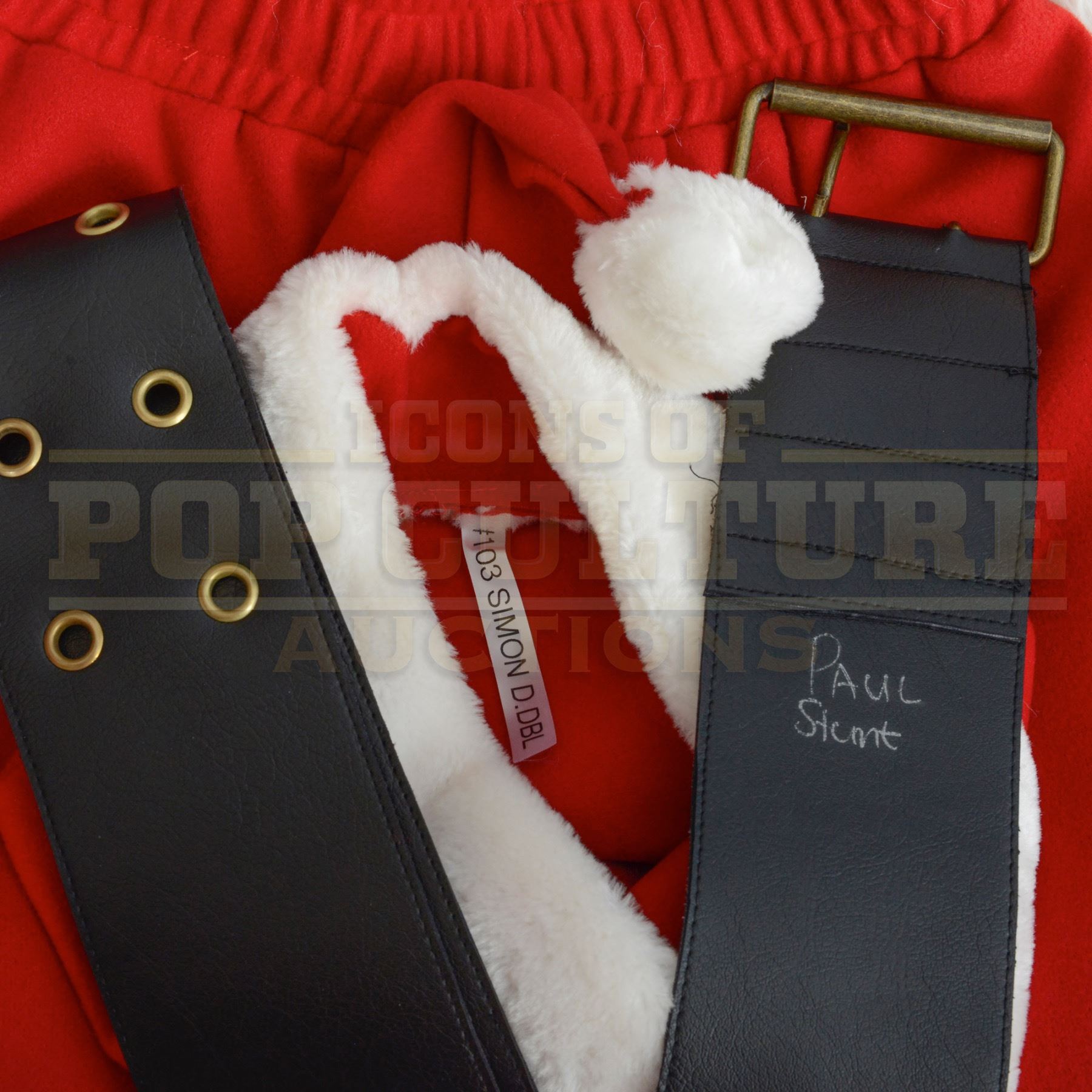 The costume consists of a faux fur-trimmed red jacket, matching pants, Santa hat, belt, synthetic white beard, and wig. Multiple interior tags and wardrobe labels clearly mark it for “SIMON,” “SIMON STUNT,” and “#103 SIMON DBL,” with one belt inscribed “Paul Stunt,” identifying it as a stunt version used during action sequences.