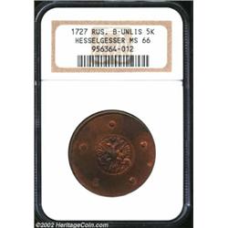Novodel copper 5 Kopecks 1727-KA, unlisted in Brekke, KMN-K5, MS66 NGC with prooflike surfaces and abundant remaining luster. Ex: Hesselgesser Collection. Important notice: We expect to be auctioning lots at the rate of 200-250 per hour. Sometimes eBay Premier live bid software cannot keep up with that pace, so we strongly recommend that you place a realistic proxy bid now as insurance to avoid disappointment. Also please note that all Heritage/CAA lots purchased through eBay Premier carry a 20% Buyer's Premium. Please make sure you read the Terms and Conditions.