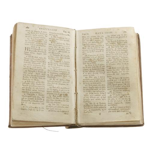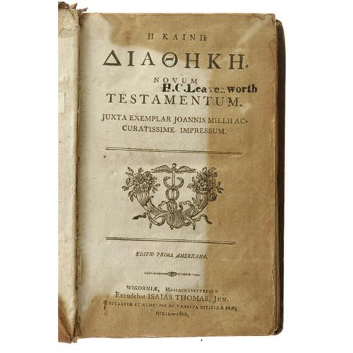 <B><I>Novum Testamentum</B></I></B></I> (Worchester, Mass: Isaiah Thomas, 1800), Editio Prima Americana (first American edition), <I>Kaine diatheke,</B></I> The New Testament in Greek; contemporary full calf. Bit of wear; some foxing and browning throughout. From the Henry E. Luhrs Collection.