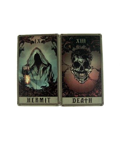 Screen used, hero, two Tarot cards including Hermit and Death with 'March 29, 4:44pm 45 East Evan St. Ny, Ny' on the back. (approx. 5 1/2" x 3 1/2")