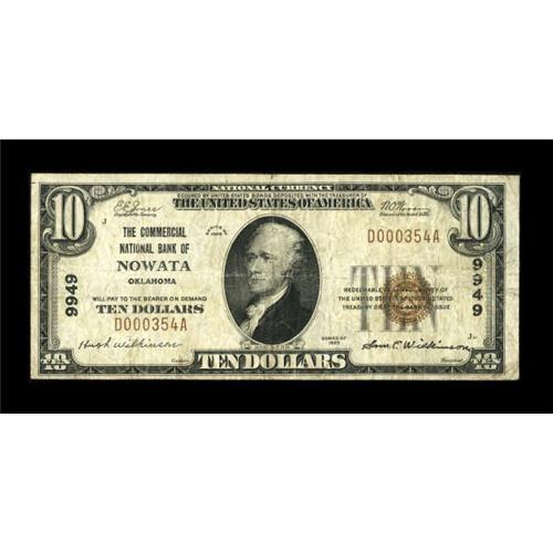 <B>Nowata, OK</B></I> - $10 1929 Ty. 1 <B>The Commercial NB</B></I> Ch. # 9949<BR> While large notes from this family operated bank are rather plentiful, Series 1929 examples are another matter entirely, with the census standing at just three such notes, including this specimen. <B>About Fine,</B></I> with even circulation. <BR><BR><b>Shipping:</b> Coins & Currency (<a target="_blank" href="http://www.heritageauctions.com/common/shipping.php">view shipping information</a>)