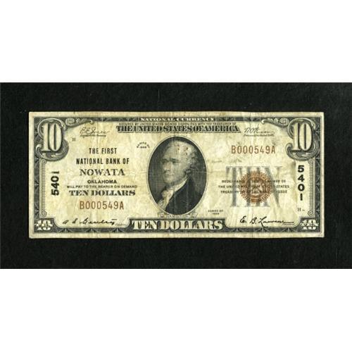 <B>Nowata, OK</B></I> - $10 1929 Ty. 1 <B>The First NB</B></I> Ch. # 5401<BR> A few pinholes are noticed along with some minor rust on this note. <B>Fine</B></I>.<BR><I>From The Rolling Plains Collection</B></I><BR><BR><b>Shipping:</b> Coins & Currency (<a target="_blank" href="http://www.heritageauctions.com/common/shipping.php">view shipping information</a>)