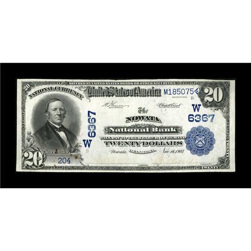 <B>Nowata, OK</B></I> - $20 1902 Plain Back Fr. 652 <B>The Nowata NB</B></I> Ch. # (W)6367<BR>Large notes only from this just plain rare Nowata bank, which disappeared forever early in 1924. Just three examples are known from here, with the last appearance at public sale coming back in 1992. <B>Very Fine,</B></I> but with some fading of the blue overprint and a few tiny rust spots at the lower left.<BR><BR><b>Shipping:</b> Coins & Currency (<a target="_blank" href="http://www.heritageauctions.com/common/shipping.php">view shipping information</a>)