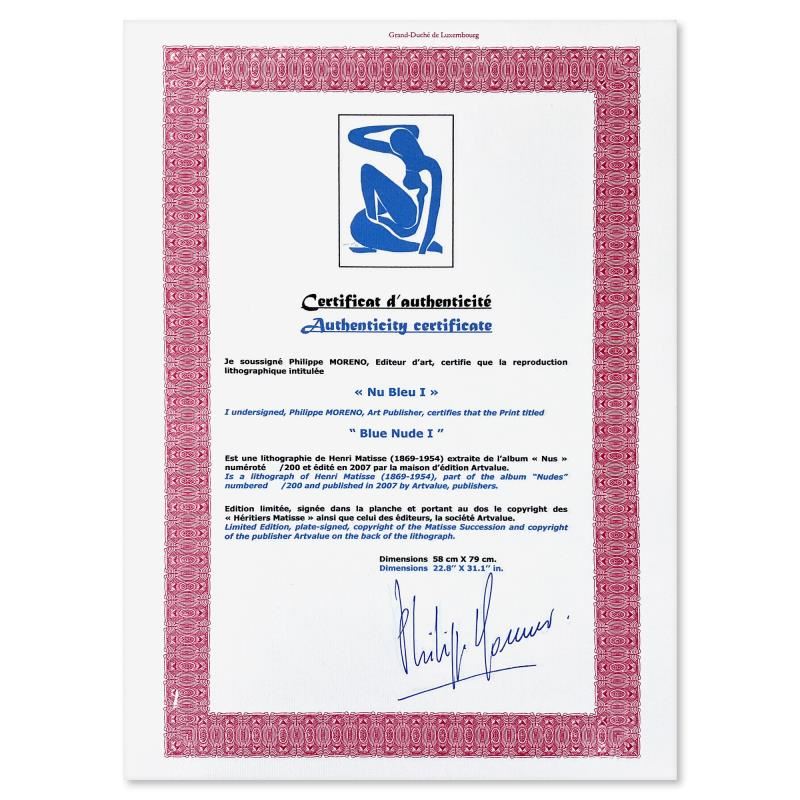 "Nu Bleu I" is a limited edition lithograph by Henri Matisse (1869-1954) bearing the plate signature of the artist. This piece comes from an edition of 200 authorized by the Matisse Estate; the edition number is not on the piece itself but on the certificate. This piece comes custom framed. Includes Certificate of Authenticity. Measures approx. 28.5" x 37" (frame), 22.5" x 31" (image).