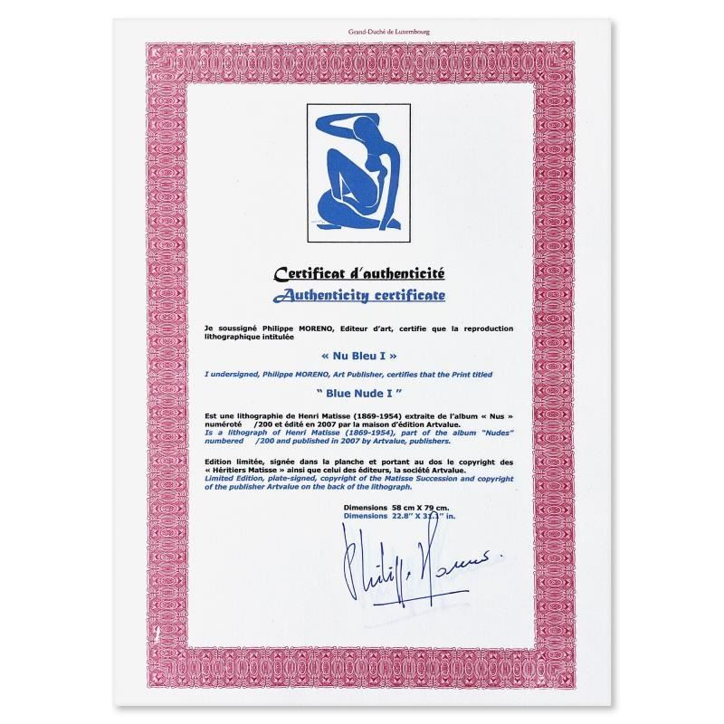 "Nu Bleu I" is a limited edition lithograph by Henri Matisse (1869-1954) bearing the plate signature of the artist. This piece comes from an edition of 200 authorized by the Matisse Estate; the edition number is not on the piece itself but on the certificate. Includes Certificate of Authenticity. Measures approx. 22.5" x 31" (image).