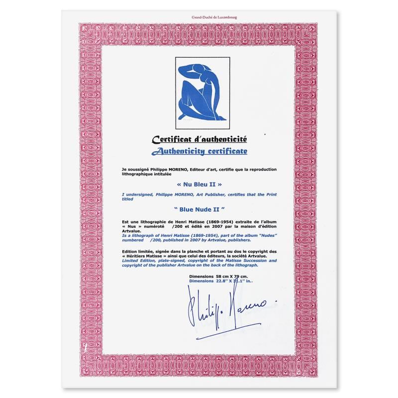 "Nu Bleu II" is a limited edition lithograph by Henri Matisse (1869-1954) bearing the plate signature of the artist. This piece comes from an edition of 200 authorized by the Matisse Estate; the edition number is not on the piece itself but on the certificate. Includes Certificate of Authenticity. Measures approx. 22.5" x 31" (image).