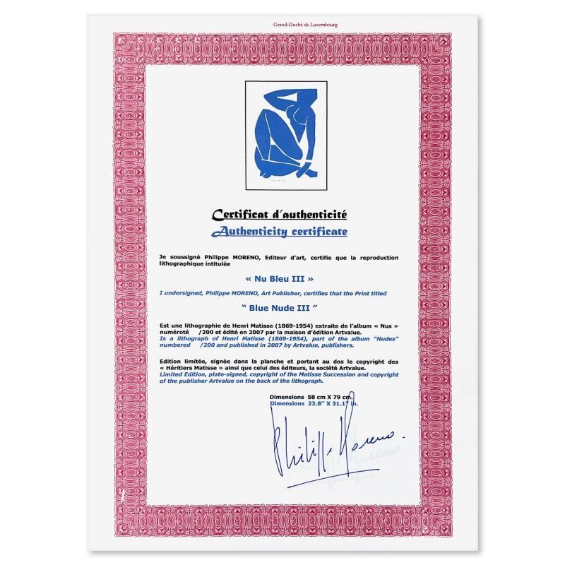 "Nu Bleu III" is a limited edition lithograph by Henri Matisse (1869-1954) bearing the plate signature of the artist. This piece comes from an edition of 200 authorized by the Matisse Estate; the edition number is not on the piece itself but on the certificate. This piece comes custom framed. Includes Certificate of Authenticity. Measures approx. 28.5" x 37" (frame), 22.5" x 31" (image).