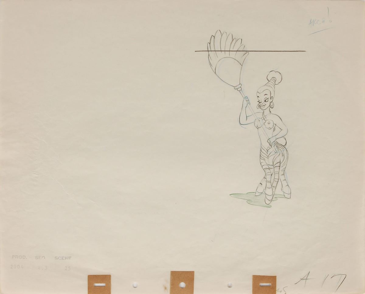 (Walt Disney Studios, 1940) Original production drawing featuring Nubian the Centaurette from the ‘Pastoral Symphony’ segment of Fantasia. Accomplished in graphite and colored pencil on untrimmed 15.5 x 12.5 animation paper. Image measures 3.25 x 7.5. In fine condition.