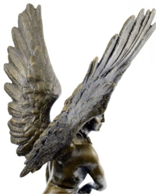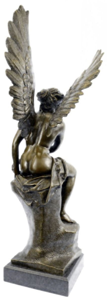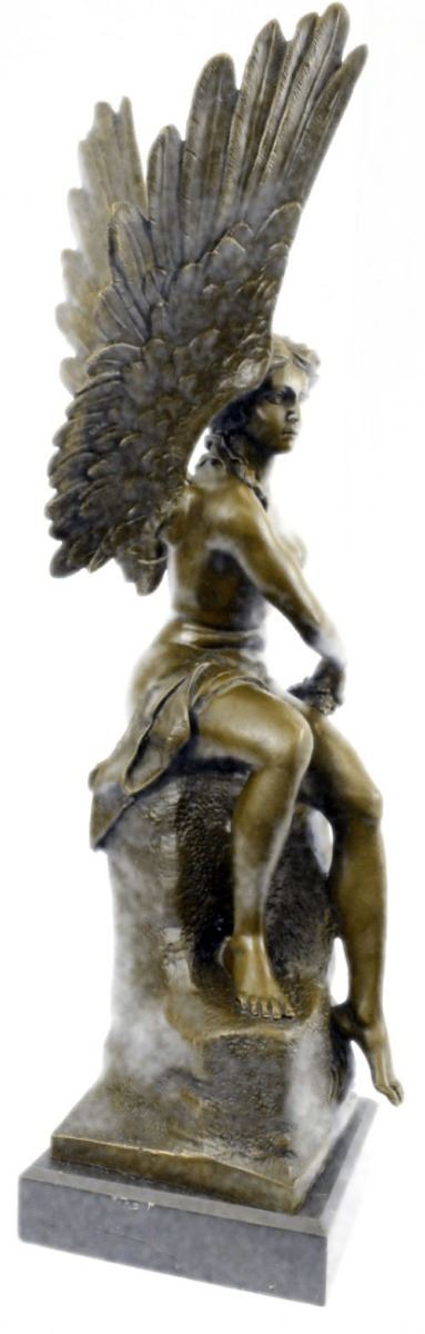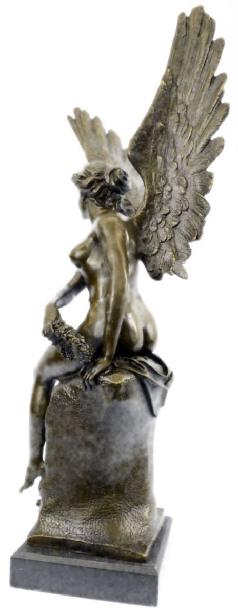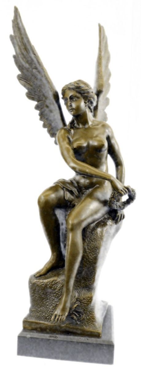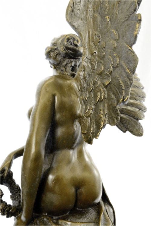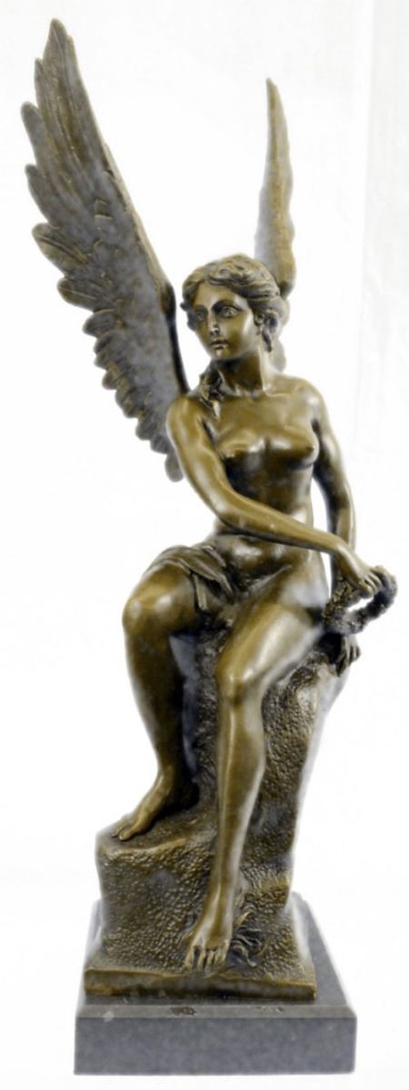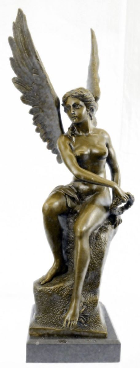 The Beautiful Angel Sits Upon Her Celestial Throne Having Surveyed An Earthly Battle. She Is Captured In The Likeness Of Ancient Roman Hellenistic Representations Of Winged Angels. The Exquisite Details Of The Feathers On Her Wings Shows The Skilled Craftsmanship Of The Artist. She Is About To Throw A Crown Of Laurel Earth-Bound To The Successor Of A Martial Victory. This bronze sculpture Is Mounted Upon A Black Marble Base. This sculpture is very interesting a bronze recast based on the original piece. Bronze Dimensions With Marble Base: Height 25" X Width 8". Weight:35 Lbs.