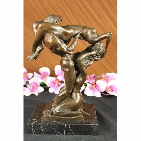 This little number will make anyone blush but yet keeps the conversation going. This unforgettable 3-some among two women and a man will leave anyone shocked. one girl is sitting between her legs with her buttocks touching the floor, while she goes down on her erotic male friend and holds her other partners head up. He is carrying his other female companion on his shoulder while she squeezes her thighs tight and caresses her head uncontrollably; caused by the pleasure she is receiving from his tongue. This marvelous sculpture shows every different cuts and lines on their bodies. The handmade bronze sculpture was cast using the age-old method of lost-wax casting and stained with a brown patina for preservation. It is mounted upon a black marble. Bronze dimensions with marble base: Height 11 X Width 7 inches. Weight: 11 lbs.