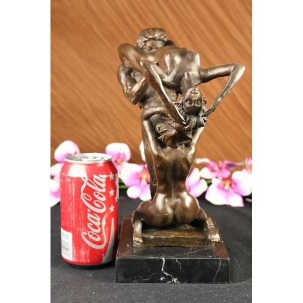 This little number will make anyone blush but yet keeps the conversation going. This unforgettable three some among two women and a man will leave anyone shocked. one girl is sitting between her legs with her buttocks touching the floor, while she goes down on her erotic male friend and holds her other partners head up. He is carrying his other female companion on his shoulder while she squeezes her thighs tight and caresses her head uncontrollably; caused by the pleasure she is receiving from his tongue. This marvelous sculpture shows every different cuts and lines on their bodies. The handmade bronze sculpture was cast using the age-old method of lost-wax casting and stained with a brown patina for preservation. It is mounted upon a black marble. Bronze dimensions with marble base: Height 11 X Width 7 inches. Weight: 11 lbs. Please Note: This is a reproduction bronze sculpture from the original molded and signed. This featured bronze sculpture is a recast after the original, and has been done recently. This 100% bronze sculpture is an abstract piece certain to be a conversation piece.